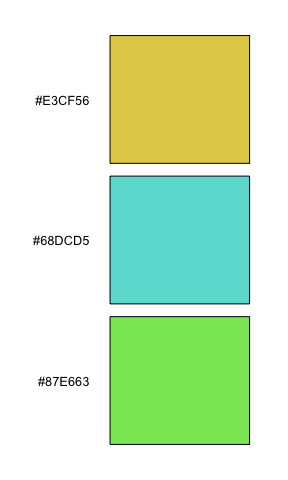 iwanthue(3, 0, 300, 60, 180, 73, 100, plot=TRUE) # fluoro