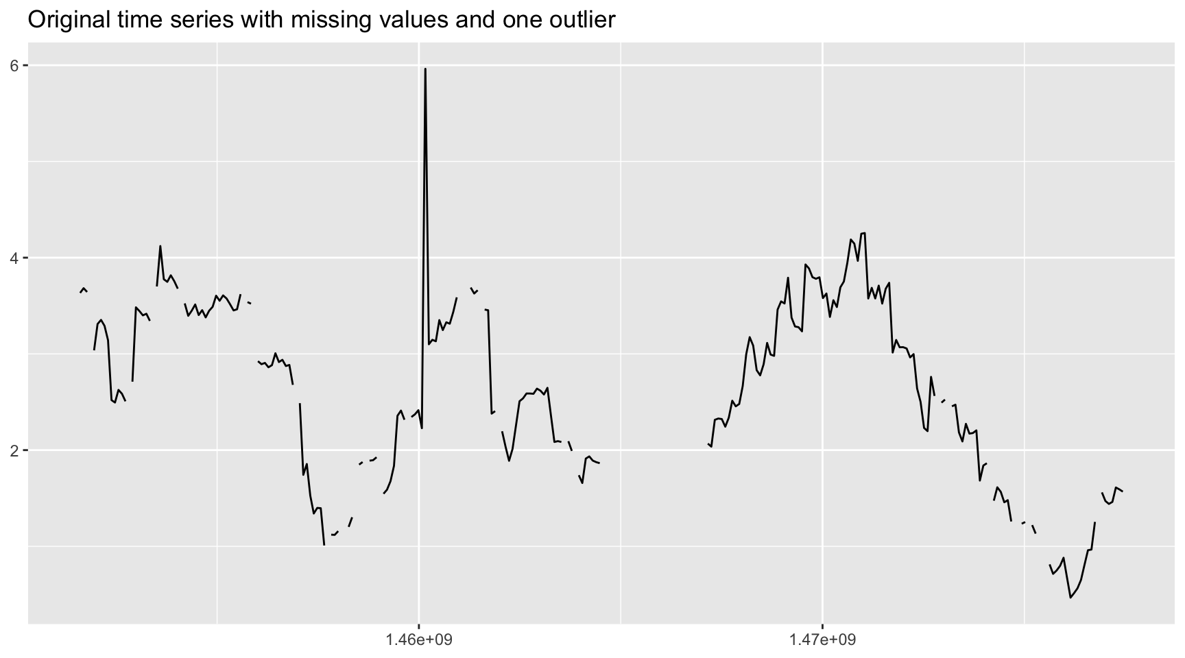 plot_imputed(y_missing, title = "Original time series with missing values and one outlier")