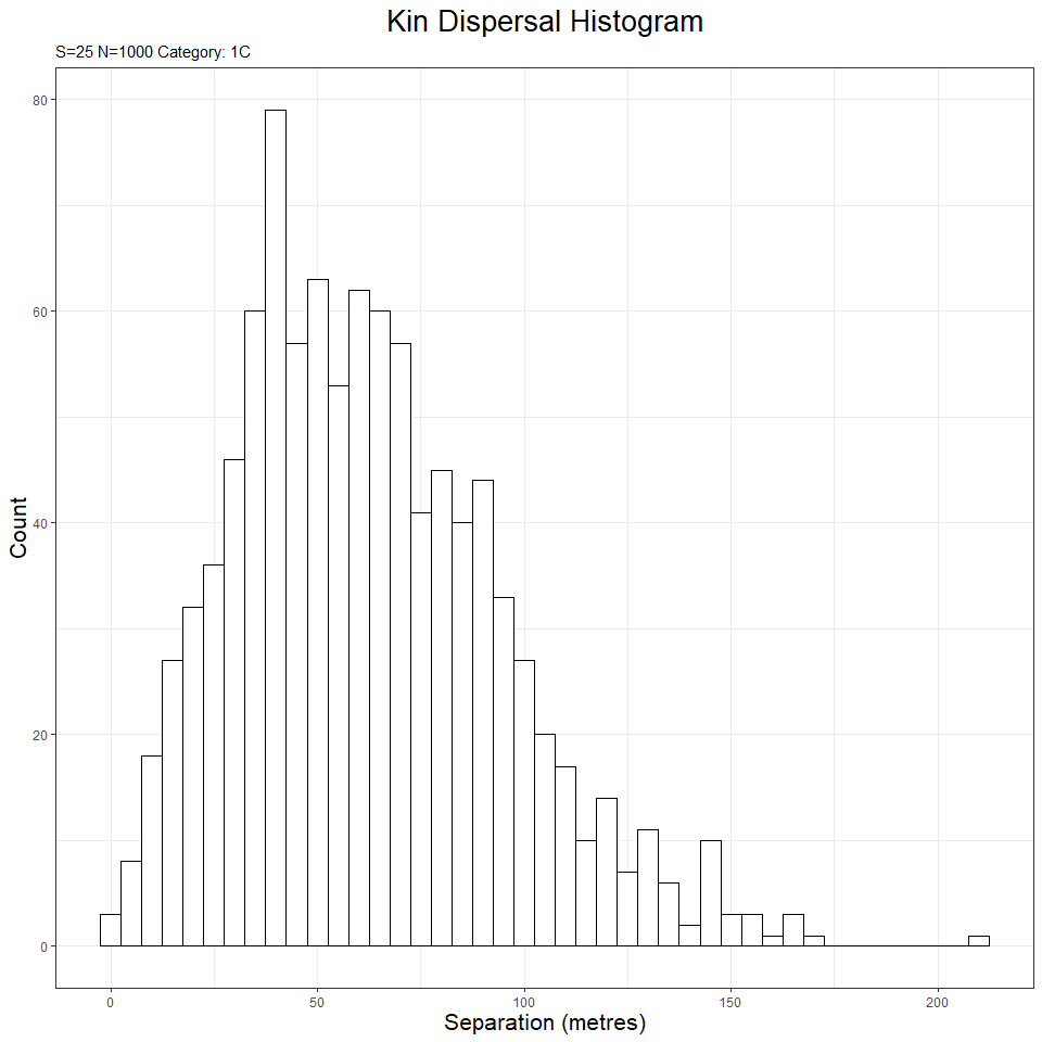 Now, before we go any further, we need to estimate how large a study site we will need to gain an adequate understanding of dispersal, and avoid missing rarer long-tailed dispersal events. We know that our FS pouch young haven’t dispersed, so we won’t need to worry about them. But what about the 1C category? At this point in an actual study, the existing model should be refined as much as possible to provide ‘realistic’ estimates of dispersal at each stage (erring on the side of larger estimates if uncertain).