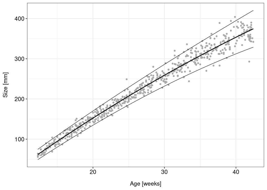 To estimate an LMLS with a quadratic effect of the babies’ age on their average size and a linear effect on the log-standard deviation, run this code: