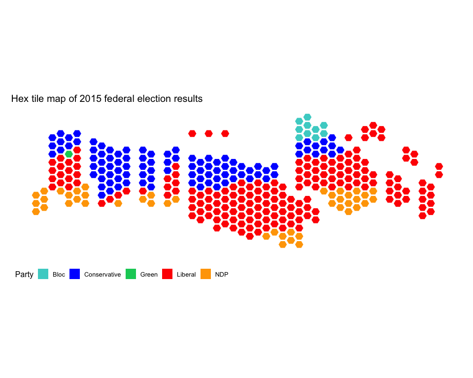 riding_binplot() can be used to create tile cartograms at federal and provincial riding levels (note that only Quebec provincial ridings are supported right now). Here is an example: