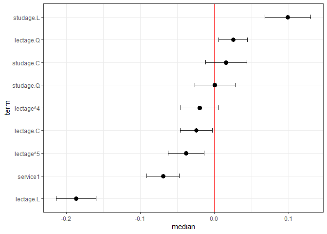 m1 <- lmer(y ~ service + lectage + studage + (1|d) + (1|s), data=InstEval)