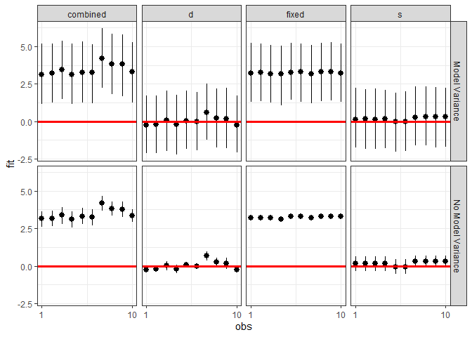 geom_pointrange() + theme_bw() + labs(x = "Bin of `d` term", y = "Predicted Fit")