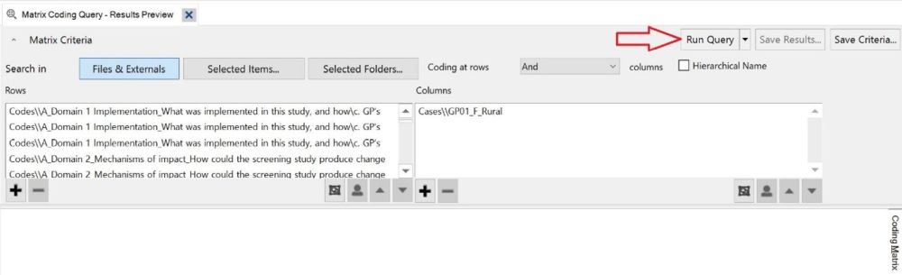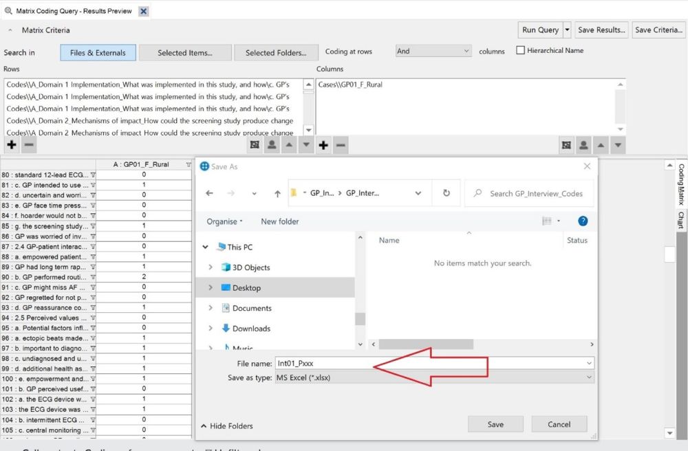 include.For our purposes, a coding matrix is an Excel spreadsheet where each row is a unique code, and each column shows how many times that code was mentioned in one interview. NVivo’s Matrix Coding Query tool can produce spreadsheets in the correct format, which we detail below.