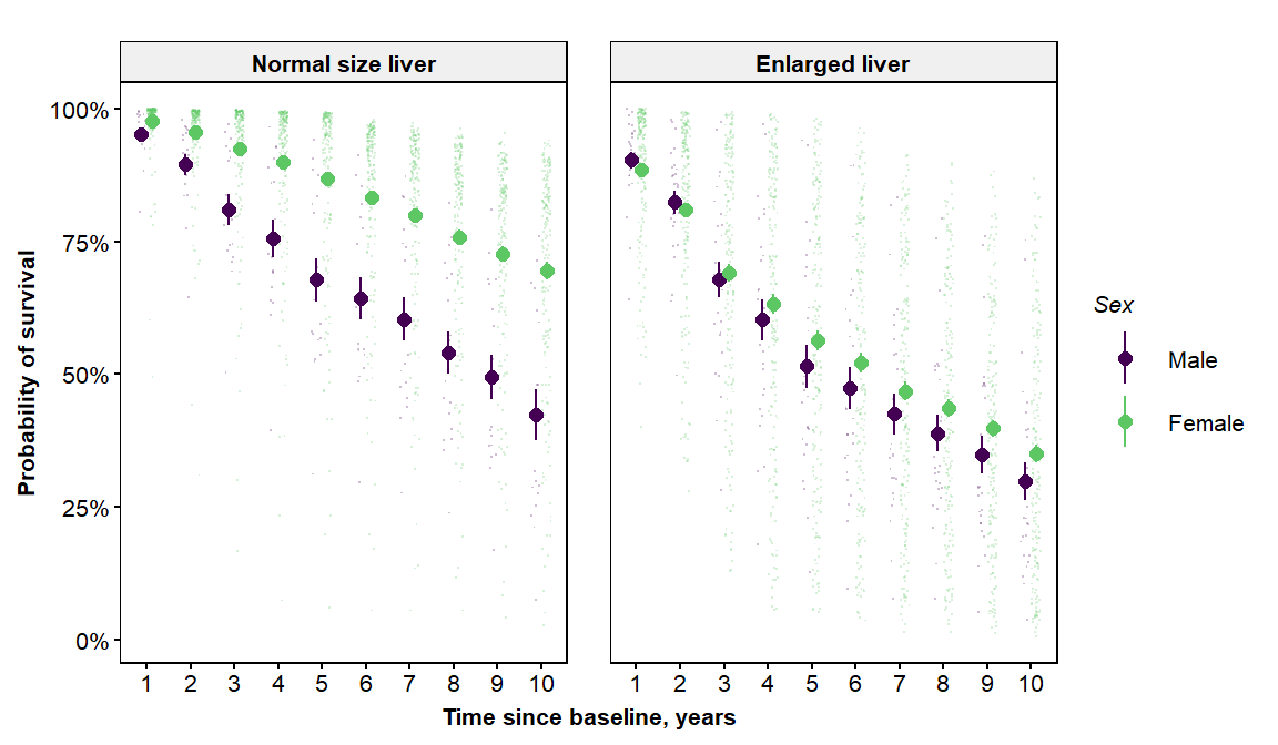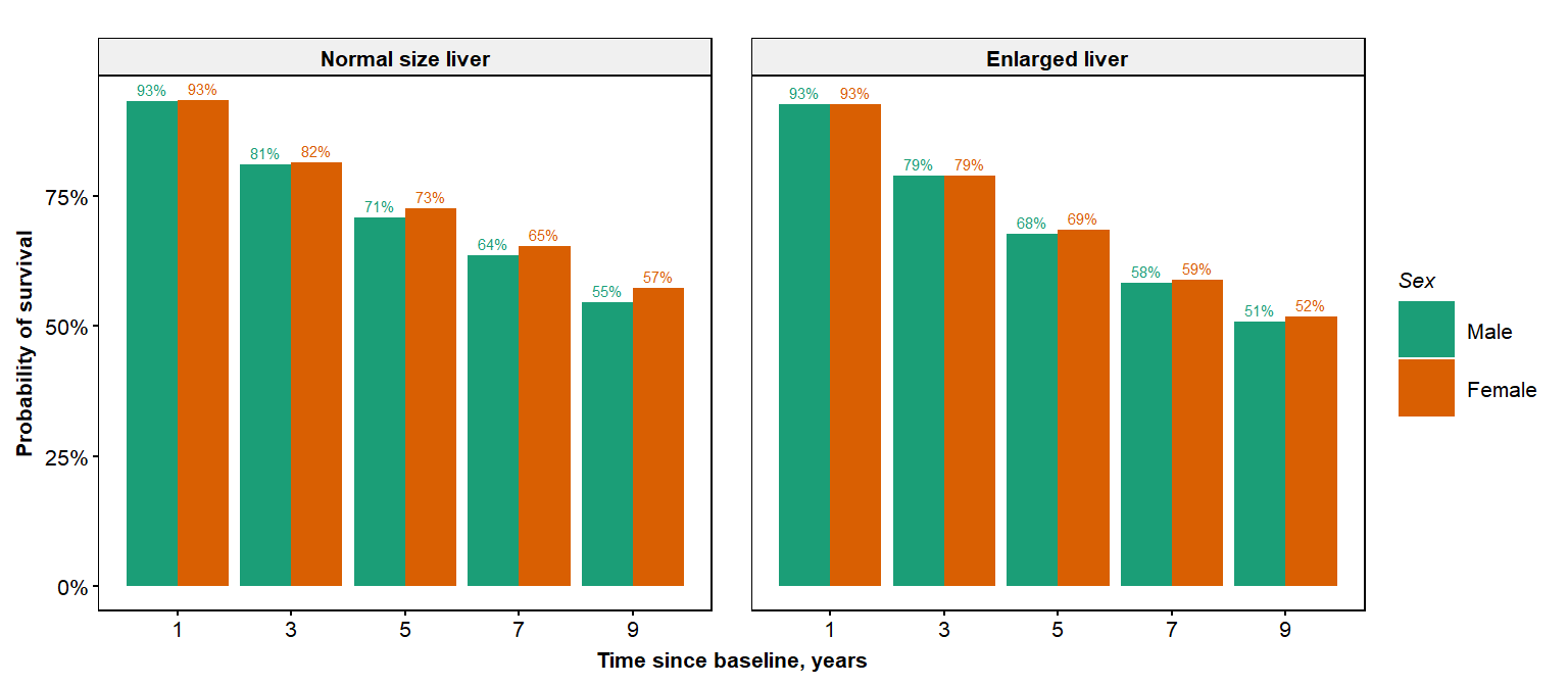 fvar='hepato',flvls=c("Normal size liver","Enlarged liver"),