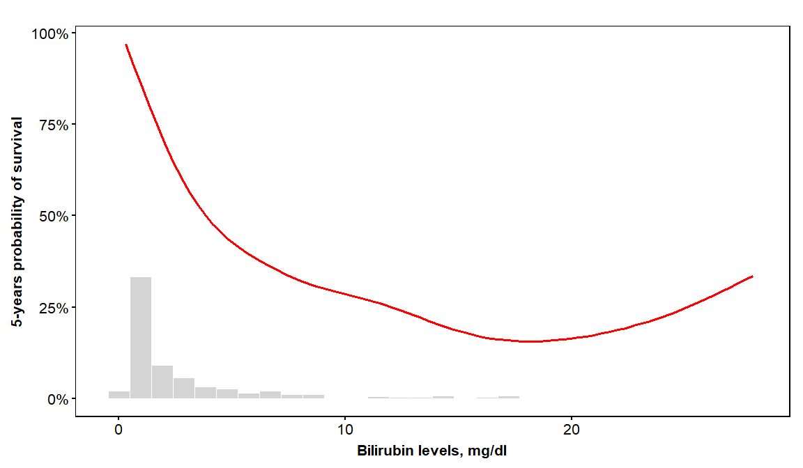 vdplot(object=orsf, xvar='bili', xlab='Bilirubin levels',