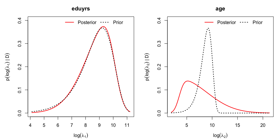 While the first posterior associated to penalty parameter for ‘eduyrs’ does not depart from its prior with a large prior mean (as \(\lambda_1 \sim {\cal G}(1,10^{-4})\) has prior mean \(10^4\)) and suggests linearity, the posterior associated to \(\nu_2=\log(\lambda_2)\) suggests a non-linear effect of ‘age’ by pointing to smaller values for the penalty parameter.