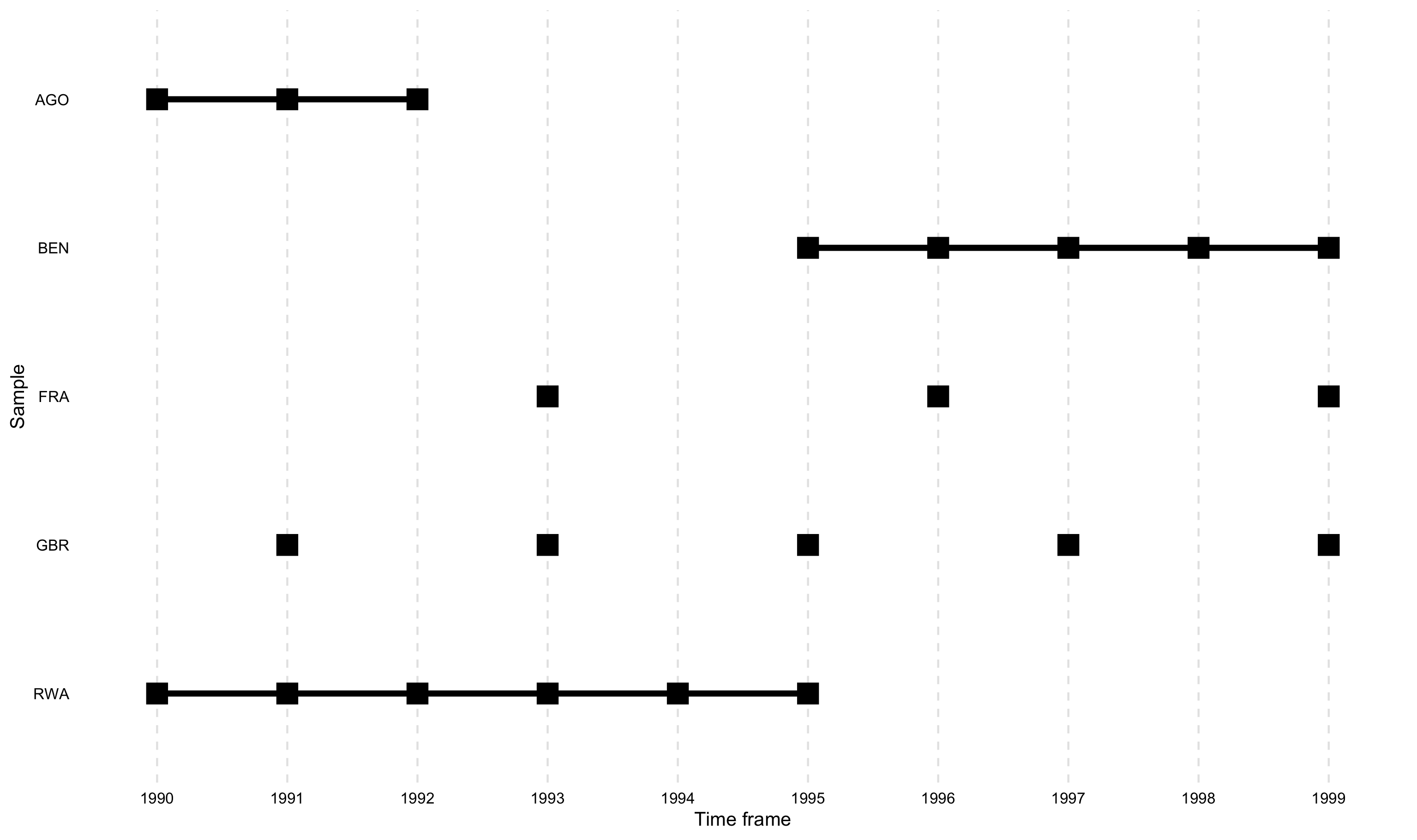 Shows time-series cross-sectional data coverage | ✓ | ||||||||