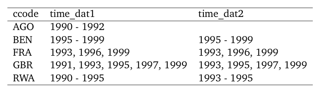 <- overview_tab(dat = toydata, id = ccode, time = year) output_table