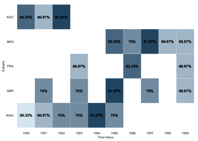 Allows to quickly report time-series cross-sectional data coverage (figure/table) | ✓ | ||||||||