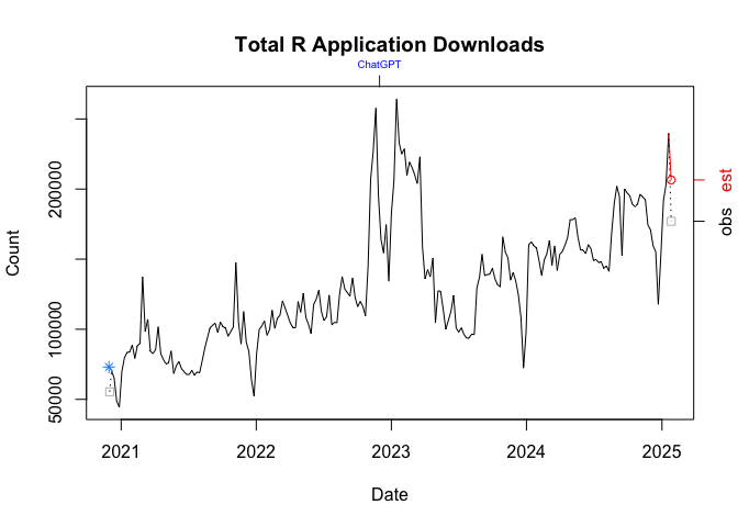 The third problem is the apparent loss (i.e., zero downloads for the R application and for all packages) for 7 logs in 2025: 8/25-8/26 and 8/29-9/02. For what it’s worth, both gaps were preceeded by two unusually large sets of downloads: Sun 8/24 (14,521,256) and Wed 8/27 & Thu 8/28 (16,860,505 and 16,477,023). These outliers are approximately twice the size of “typical” counts (see graph below).