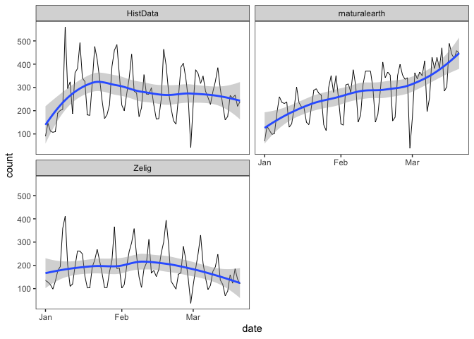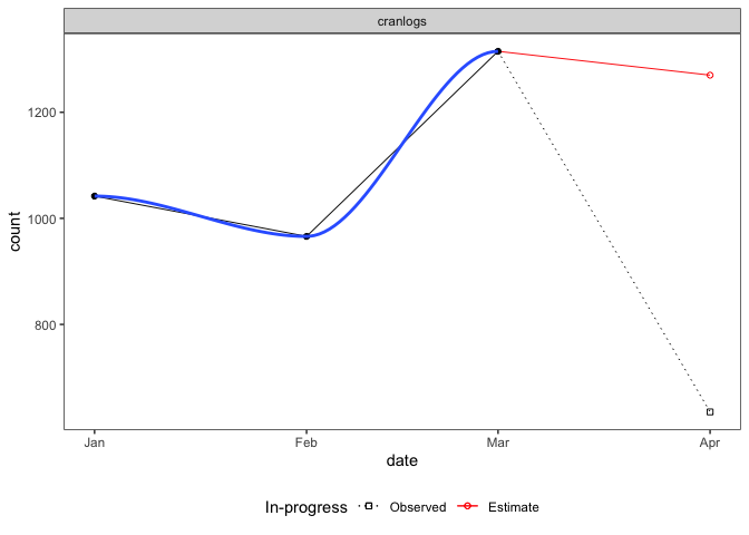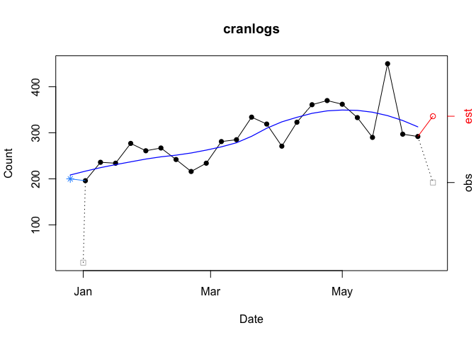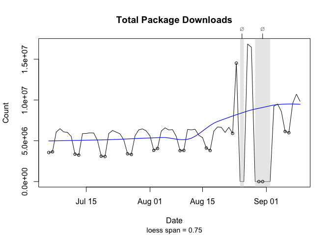 Second, when plotting cranDownloads() two gray polygons to highlight those dates are added to the graph and are labeled with a “⌀” (empty set) on the top axis. Third, smoothers ignore these missing dates.