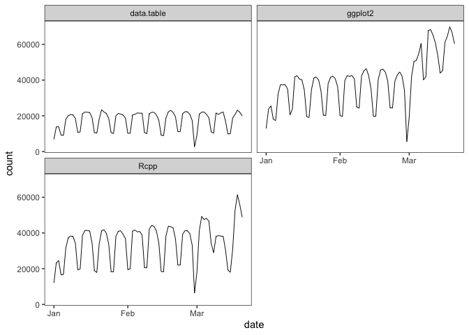 If you pass a vector of package names for multiple days, plot() uses ‘ggplot2’ facets: