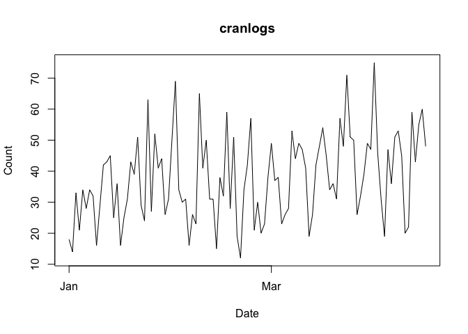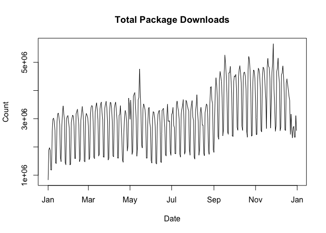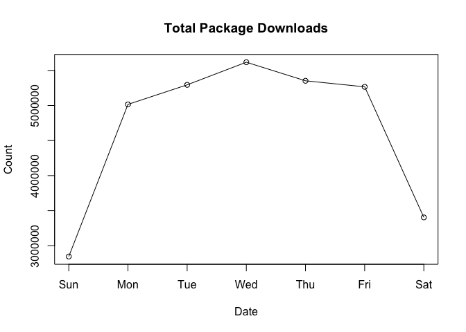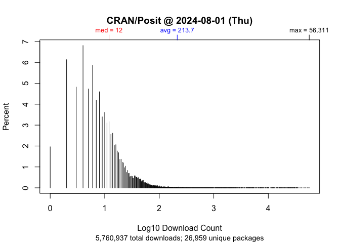 The summary method provides the number of unique packages downloaded, the total number of downloads and the five number summary (plus the arithmetic mean):