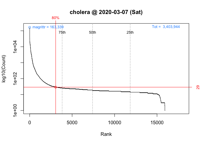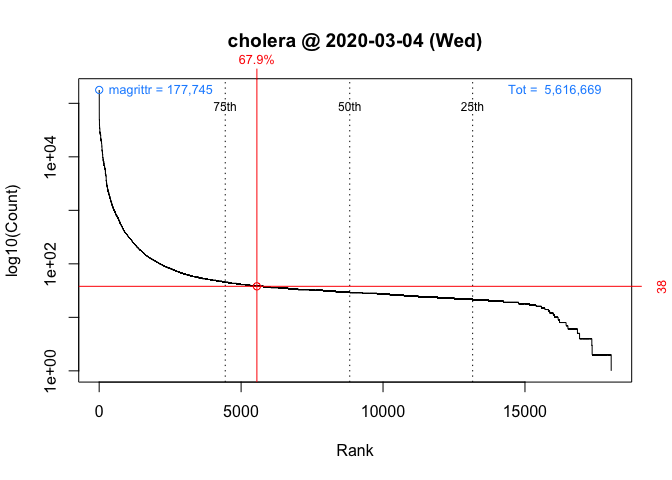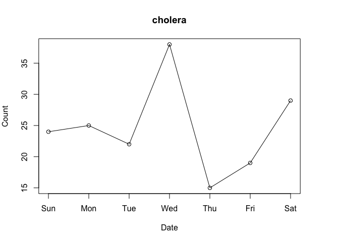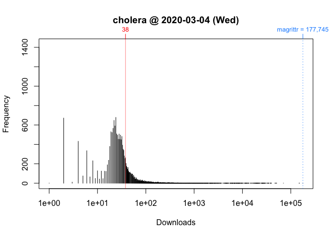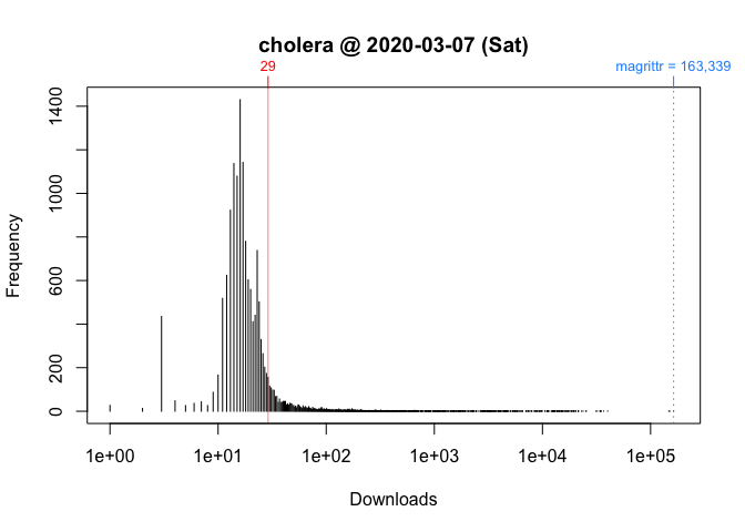 As a “fix” for the missing data, which are stored as a vector of dates in cholera::missing.date, I did the following. First, when a missing date is included, cranDownloads() prints a message in the console: