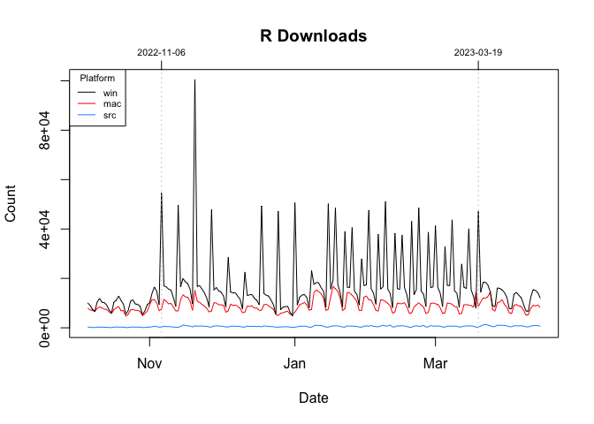 plot(cranDownloads("R", from = "2022-10-06", to = "2023-04-14"))