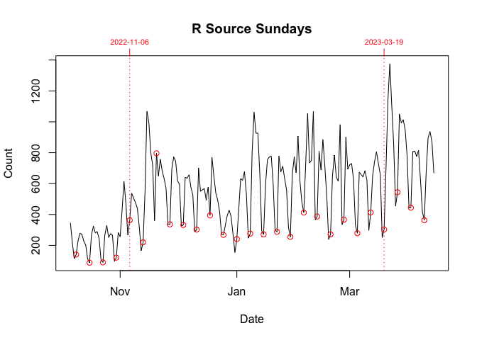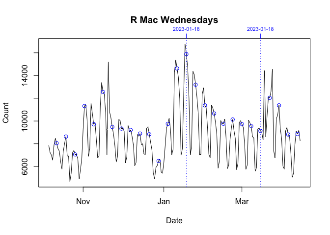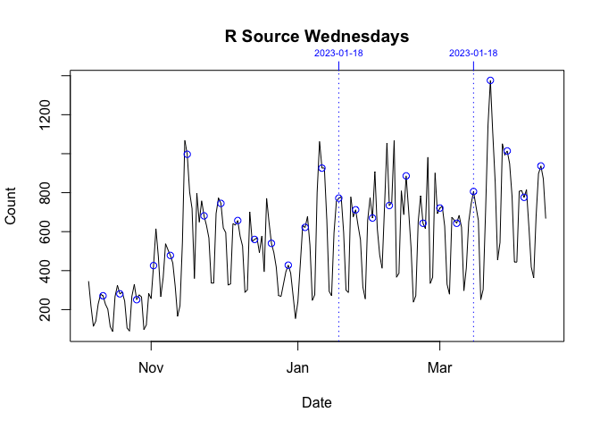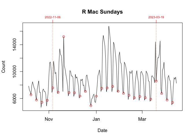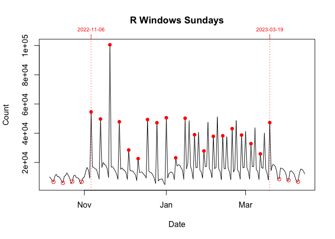 R Windows Sunday and Wednesday download spikes (06 Nov 2022 - 19 March 2023)