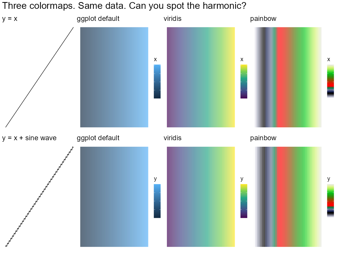 patchworktitle = "Three colormaps. Same data. Can you spot the harmonic?",