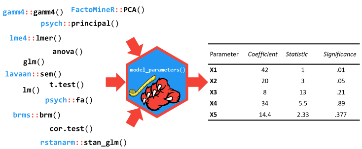 parameters’ primary goal is to provide utilities for processing the parameters of various statistical models (see here for a list of supported models). Beyond computing p-values, CIs, Bayesian indices and other measures for a wide variety of models, this package implements features like bootstrapping of parameters and models, feature reduction (feature extraction and variable selection), or tools for data reduction like functions to perform cluster, factor or principal component analysis.