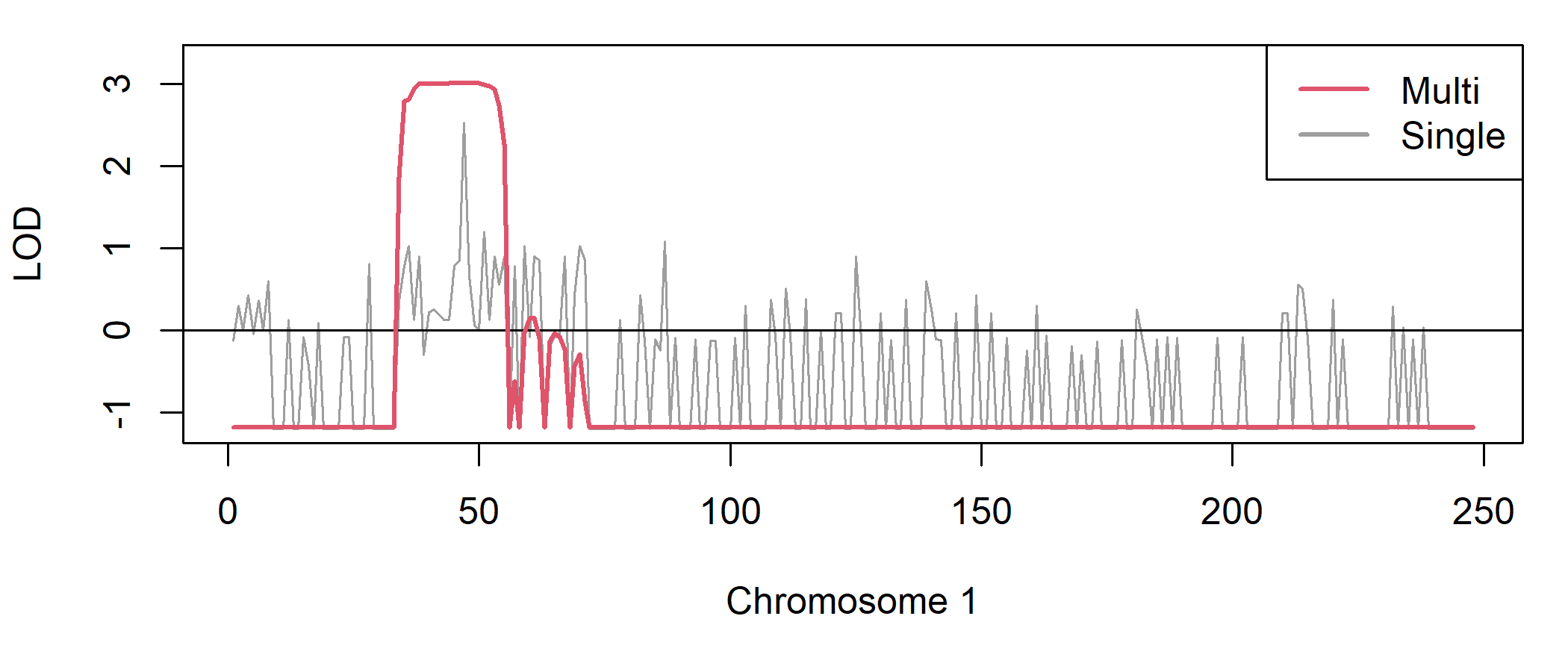 legend("topright", c("Multi", "Single"), col = c(2, 8), lwd = 2)