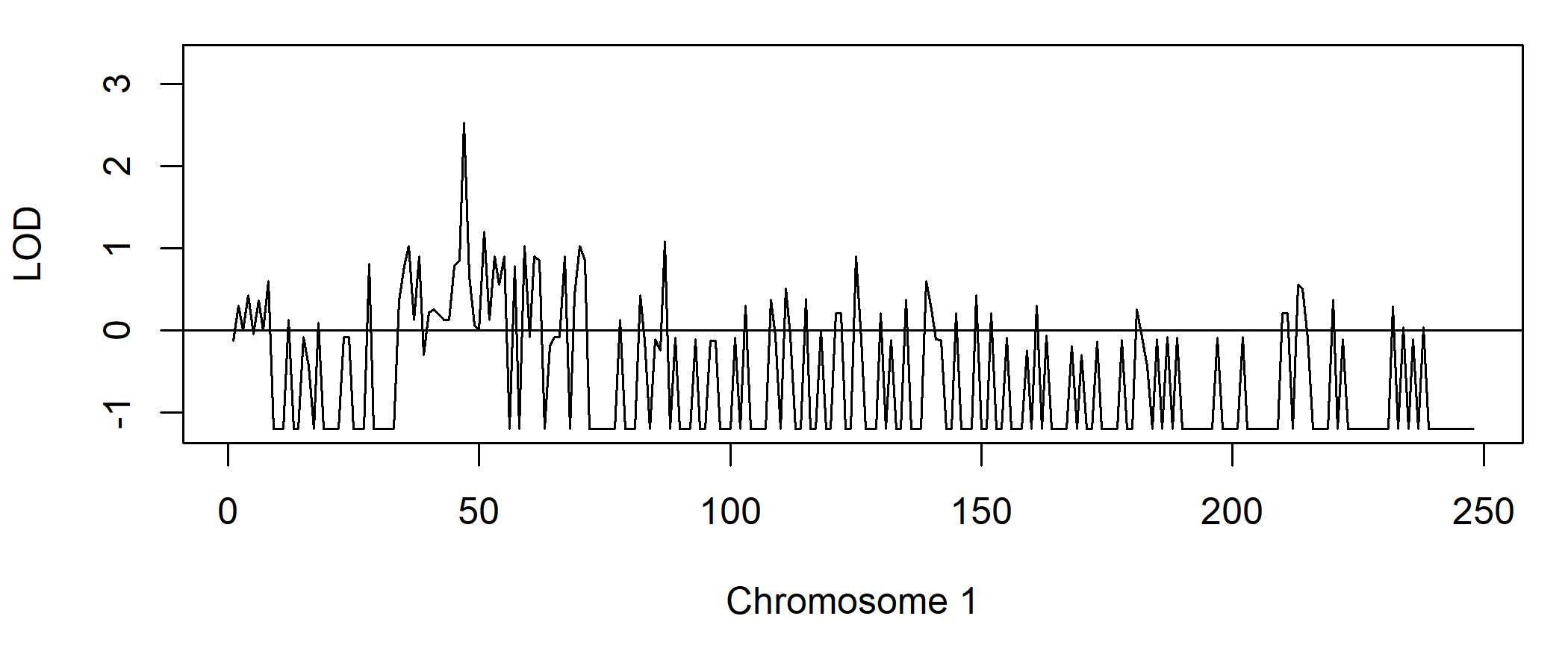 In other words, the disease locus is most likely somewhere on chromosome 1 between 34 Mb and 56 Mb.