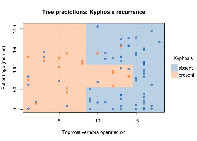main = "Tree predictions: Kyphosis recurrence" # custom title