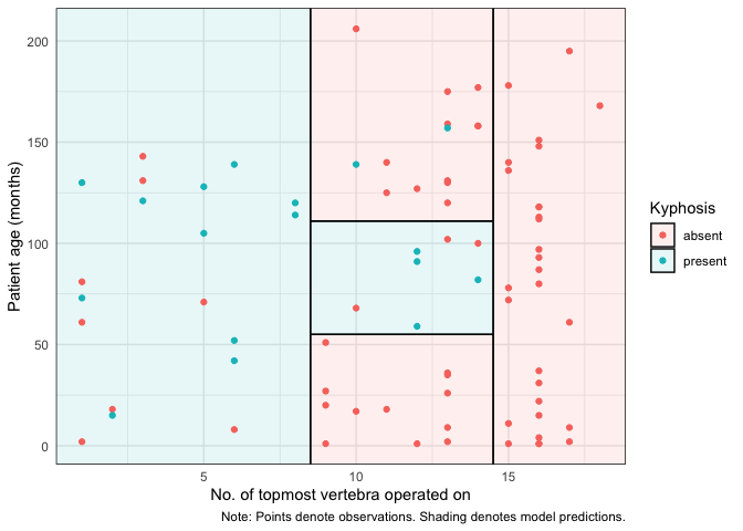 The parttree homepage includes an introductory vignette and detailed documentation. But here’s a quickstart example using the “kyphosis” dataset that comes bundled with the rpart package. In this case, we are interested in predicting kyphosis recovery after spinal surgery, as a function of 1) the number of topmost vertebra that were operated, and 2) patient age.