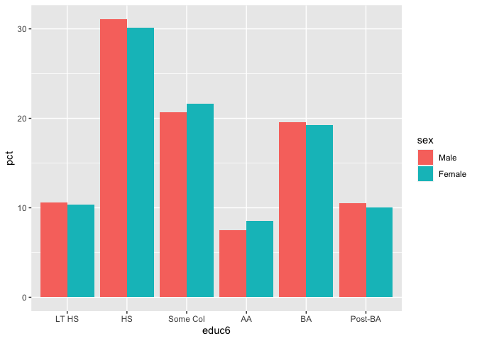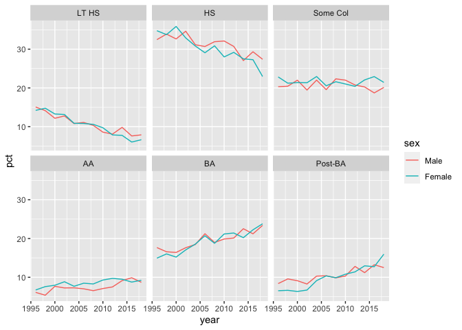 knitr::kable(digits = 0)| sex | LT HS | HS | Some Col | AA | BA | Post-BA | n |
