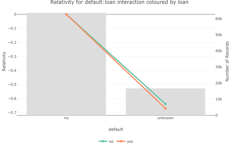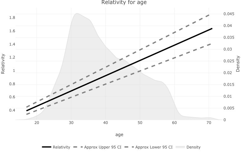 For discrete variables the number of records in each group will be plotted on a second axis.