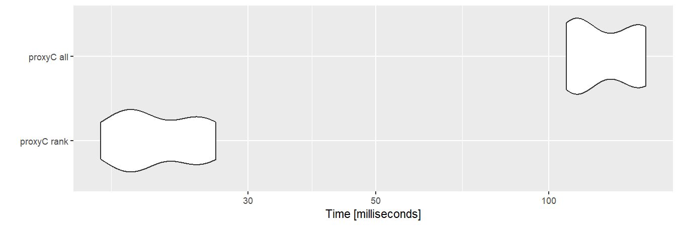 dm10k <- as.matrix(sm10k)With sparse matrices, proxyC is roughly 10 to 100 times faster than proxy.