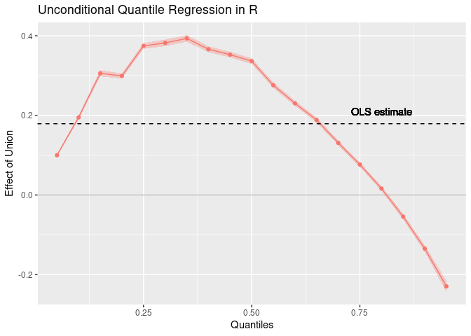 We are interested in the unconditional quantile partial effects (UQPE) of union membership on log hourly wages. We therefore estimate RIF regressions on union status and control for demographic characteristics. The parameter statistic specifies quantiles as our distributional statistic of interest, while probs defines the probabilities of the quantiles.