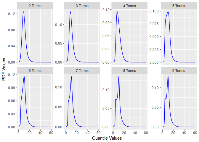 You can also retrieve quantile, density, and probability values similar to other R distributions.