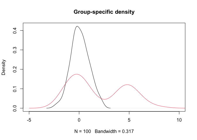 g plot(density(y[g==1]), xlim = c(-5,10), main = "Group-specific density")
