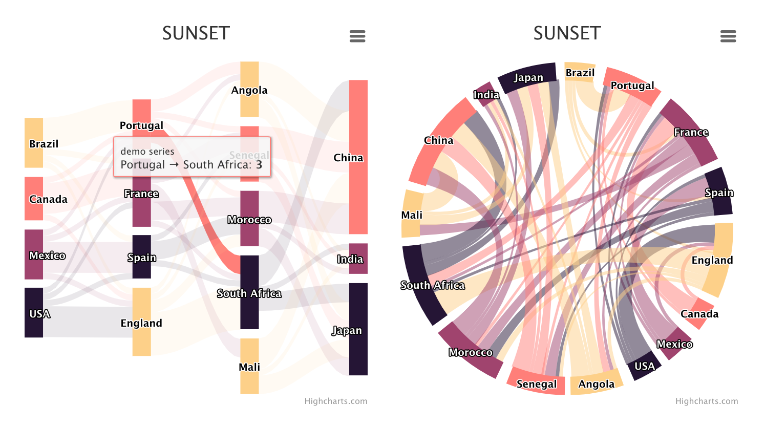 Dependency wheels and sankey diagrams can be drawn by many R Packages, such as circlize, networkD3, and ggalluvial. These packages are very powerful and easy to use, so why bother to write another duplicate package? As we can see, there are some relationships exist between dependency wheels and sankey diagrams. So why not combined these two types of charts into one R function. At the same time, it would be great to add a little interactivity to the graph. ‘Highcharts’, a commercial javascript charting library, can help me realize these ideas. By binding R functions and the ‘Highcharts’ charting library, ‘sankeywheel’ package provides a simple way to draw dependency wheels and sankey diagrams.