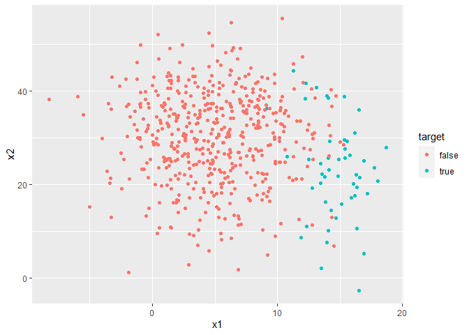 library(ggplot2)Now lets generate an imbalanced dataset.
