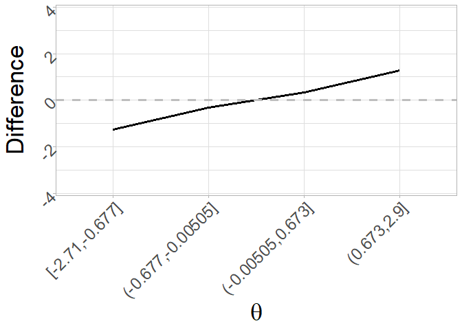 Finally, bias can also be plotted with the function plot_difference() as a function of different levels of \(\theta\). Default is to plot the difference as a function of 4 levels of \(\theta\):