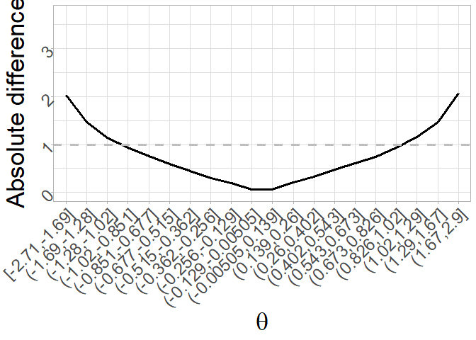But this can be changed by changing the default of the arguments type and levels to plot, for instance, the absolute difference for 20 levels of the latent trait: