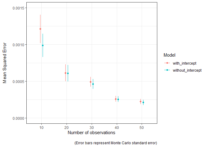 The model estimates are closer to the truth (MSE is lower) as the sample used to fit the model increases in size. The Monte Carlo standard error can easily be visualised to convey the uncertainty in these estimates. The model without the intercept term seems to be a bit better, mostly when sample sizes are lower.