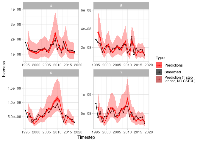 Finally, the package allows for calculating the surplus production on a yearly basis, and model the impact of different variables on that productivity. You can then produce one step ahead predictions for the biomass.