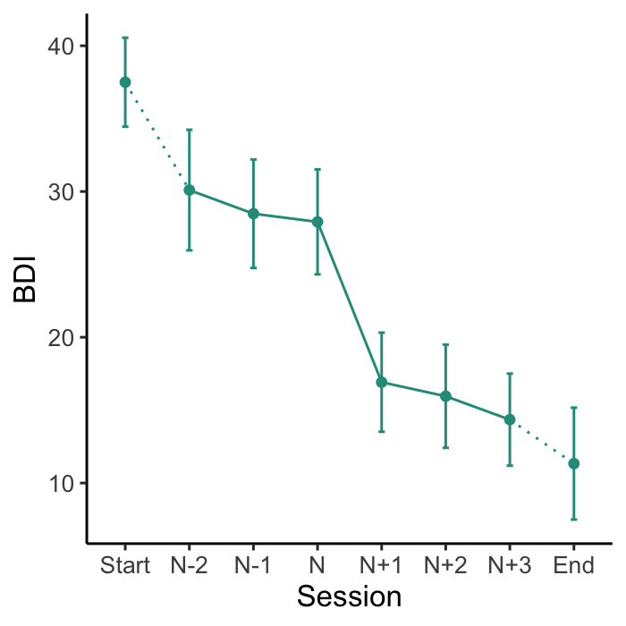 # Create plot of average change in depression symptoms (BDI) around the gain