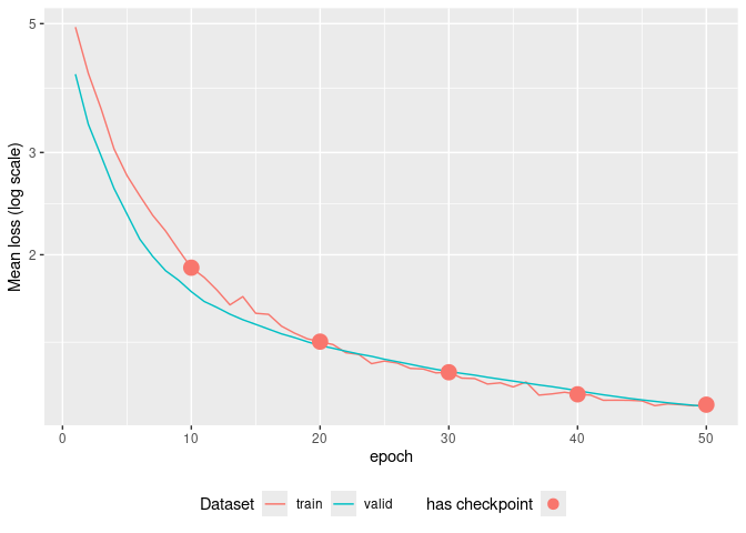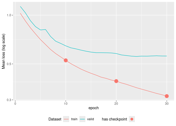 <- tabnet_fit(rec, train, epochs = 30, valid_split=0.1, learn_rate = 5e-3)