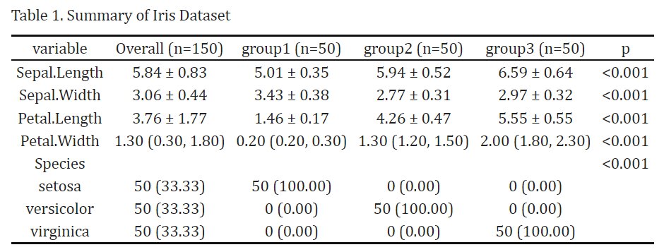result kbl(caption = "Table 1. Summary of Iris Dataset",