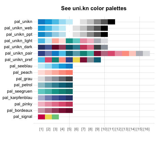 Originally, the unikn package primarily provided the 16 color palettes of the University of Konstanz: