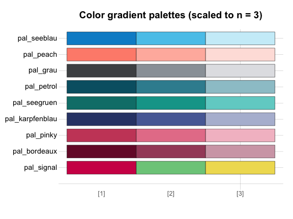 Several more specialized color palettes combine the elements of nine color hues. The preferred colors are contained in palette pal_unikn_pref: