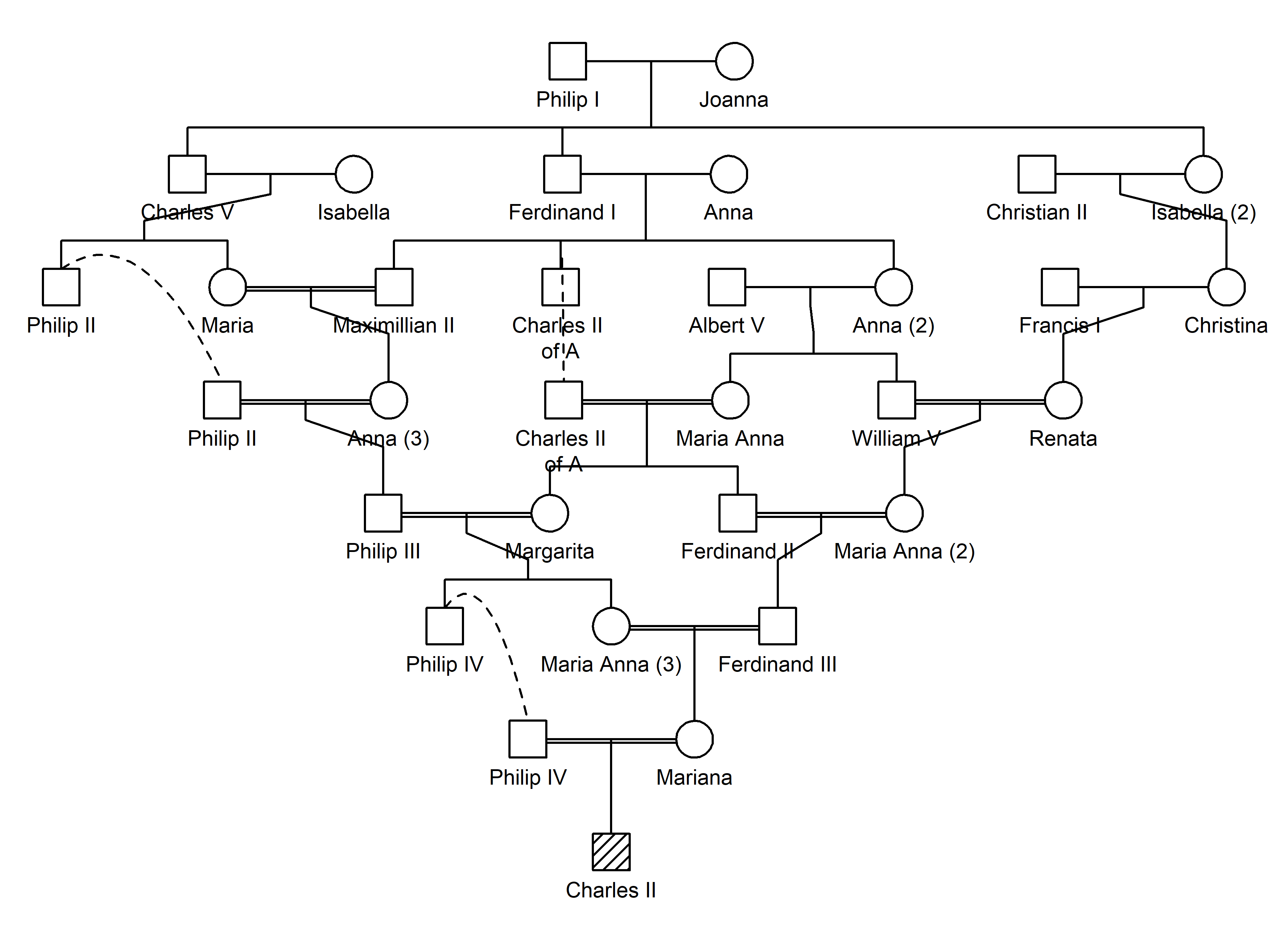 #> Philip IV-Philip III-Philip II-Charles V-[Philip I,Joanna]-Ferdinand I-Charles II of A-Margarita-Maria Anna (3)-Mariana