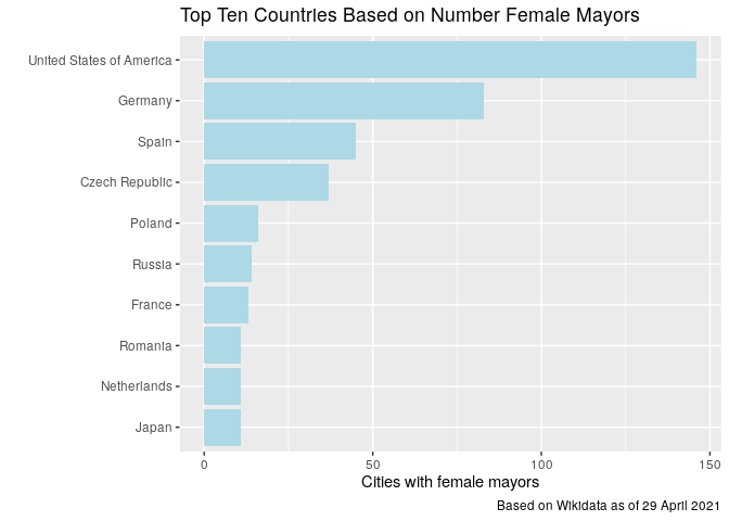 In this example, a bar chart is created to show the top ten countries according to the number of cities with female mayors, according to data in Wikidata: