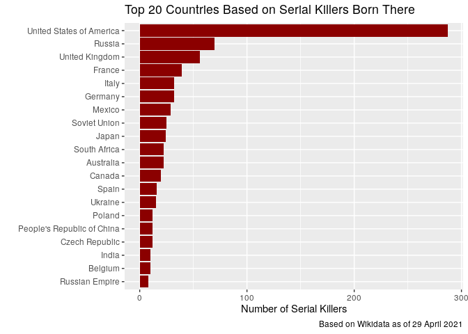 serial_killers <- 'SELECT ?countryLabel (COUNT(?human) AS ?count) WHERE {