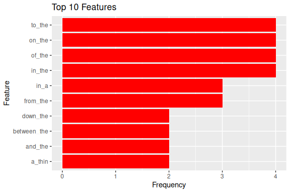 The following example plots the top 10 most occurring bi-grams along with their frequencies:
