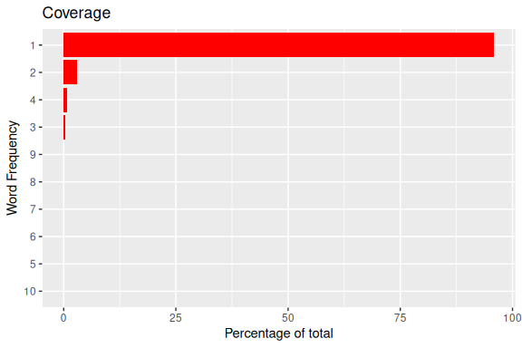 The following example plots the n-gram frequency coverage. It shows the percentage of n-grams with frequency 1, 2 … 10.