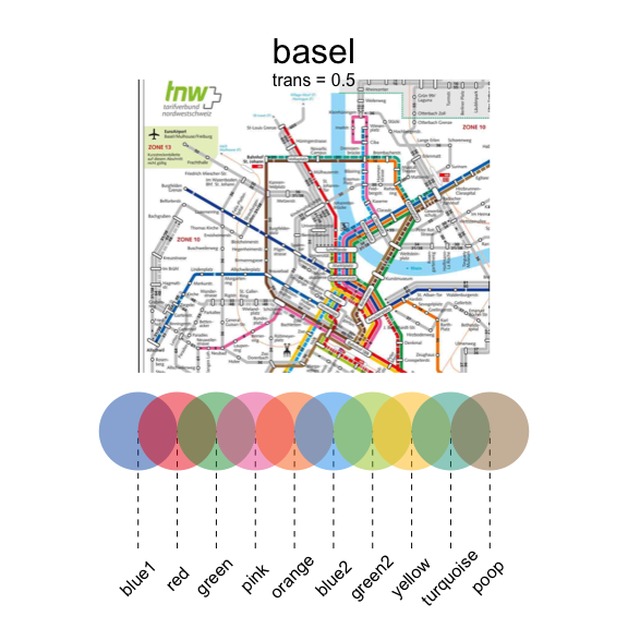 Once you find a palette you’d like to use, you can return the colors as a vector by specifying the name of the palette in the palette argument. Here is the Basel palette